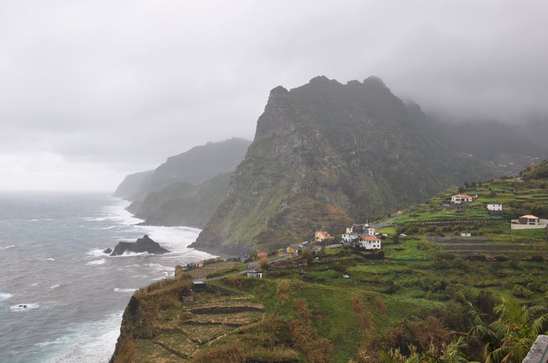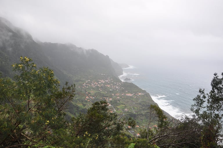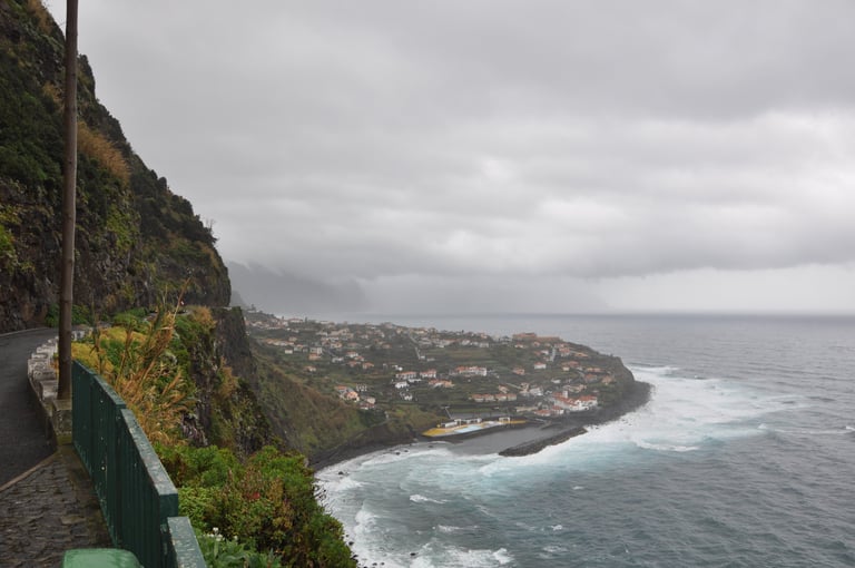 Another great day out in our hire car took us to the north coast of Madeira and the charming village of São Vicente. The drive itself was an experience, with narrow mountain roads twisting through deep valleys and cloud-kissed peaks before descending toward the wild Atlantic. São Vicente, with its traditional stone houses and peaceful vibe, felt like a world away from the busier south coast. The dramatic sea cliffs surrounding the area were amazing in the rough weather, towering walls of rock rising straight from the angry ocean, battered by waves and covered in lush greenery. We stopped frequently just to take in the views, watching the surf crash against the cliffs below or the huge waterfalls crashing from the mountains while feeling completely immersed in Madeira’s raw, untamed beauty.