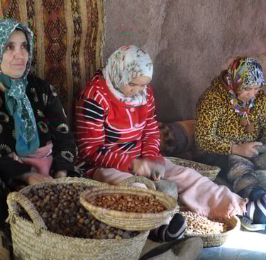 The following day we again woke early, making sure we had enough time to sort ourselves out and grab a bit of breakfast before the 9:15am promised pick up time for our trip to the Ourika valley and the mountains. This time we took six boiled eggs and a couple of apples form the restaurant for our dinner then waited by the hotel gate for our pick up…and waited…and waited. Our pick up finally arrived at 10:00am with no apology for being late, in a minivan with four other passengers, two German couples looking for a day in the mountains like us. We were soon on the road to the Ourika valley and then as soon stopped at our first shop for a “toilet break" and time for a look round the goods on offer. Now we may be being a little cynical and the other passengers may have been in the minivan for a lot longer than us, but we had the feeling that this was going to be the order of the day. After around 15 minutes we moved off again and travelled onwards for another hour or so to a “real berber house” experience. This was again a complete farce, there was a stream of tourists being funnelled through a property, introduced to four ladies using using traditional methods to extract oil from Argan nuts. We were then sat in a tent and given a fragment of flat bread to sample the oil made to eat and also allowed a wipe of different products made as skin treatments and soaps on our hands. We were sure that the woman that was explaining the products to us was competing in an olympic speaking contest, to get us through before the next group turned up, she spoke that fast her words all seemed to blend into one. She then ushered us into the over priced local product shop. Inside the shop there was an interesting and gigantic old nut press and a large stone nut crusher, but when these were mentioned, the woman brushed these off by saying these were not used any more, but would we like to buy some oil?