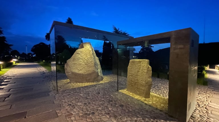 after our second night at Muller Up Strand we ventured back across the 11 miles of the Great Belt Bridge and officially back into mainland Europe! This took us to Jelling to discover a bit about our Viking ancestors (let’s face it, we all have a bit of Viking in our DNA!) The Jelling Stones are considered the birth certificate of all of Denmark. One raised by King Harold Bluetooth (yes that’s where your Bluetooth device gets its name!) as a monument to his father, Gorm, it proclaims Harold as conquerer of all of Denmark and Norway, the first time Denmark had ever been mentioned in history and states Denmark’s conversion to Christianity ending the pagan Viking era. Erected in 965 alongside another stone raised by Gorm in honour of his wife Thyra. The whole complex consists of a church, two large burial mounds, the blueprint of a large stone ship and new steel posts symbolically standing where the outer oak perimeter fence of Harold’s once stood. Not only is this place stepped in history, it is well presented, impeccably clean and free to see, they even light up the stones at night where they look even better! Glad we made the effort…..Skoll! Tracey also went window shopping for a bungalow before imagining herself as a shield maiden!