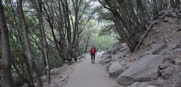 The return journey down the cables was equally as harsh on the hands and as as we had started out early it was also hampered having to stop for others climbing up. However we made it down in one piece and started the long trek back down along the same route as we had come, stopping briefly to soak our feet in the river that follows Little Yosemite Valley until we returned to the point at which the trail had split for the detour to the top of the Nevada falls. At this point you can choose to return the way you came back down the Mist Trail our take the detour and follow the Muir Trail, a slightly longer route (about an extra 1.5 miles). We decided to take in the extra route and follow the Muir Trail and were glad we did, not only is it slightly less steep, it offers you some stunning new views of the Nevada Falls and Half Dome at a distance.
